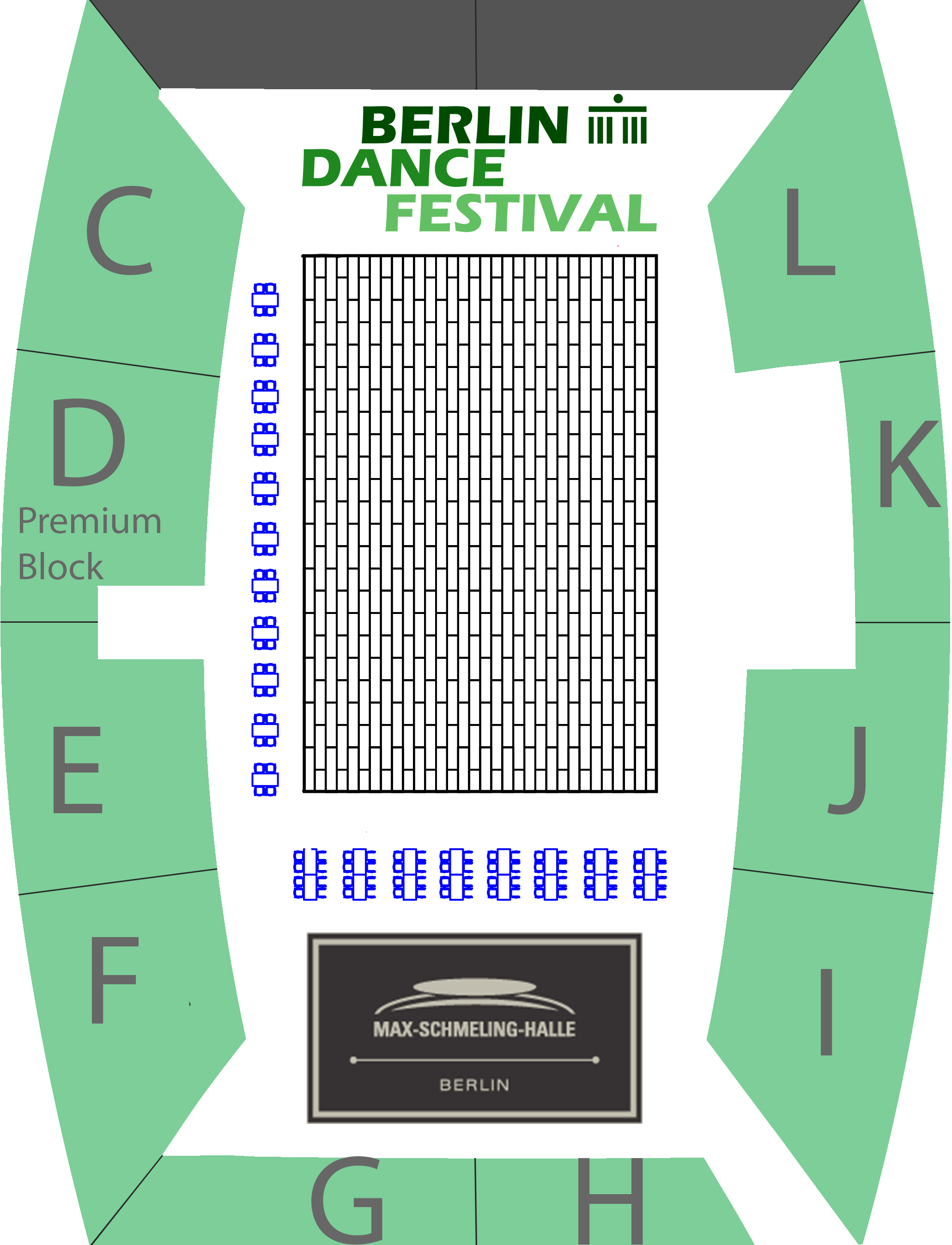 Das Bild zeigt den Grundriss des Unterrangs der Max Schmeling Halle mit Beschriftung der Zuschauerblöcke C bis L. Oben links liegt Block C, Unten links Block F. Am Unteren Bildrand von Links nach rechts Bloch G und H, auf der rechten Seite von unten nach oben Block I bis L. Im Innenbereich ist die Tanzfläche dargestellt und an zwei Seiten (Links und Unten) sind Tischplätze angedeutet.